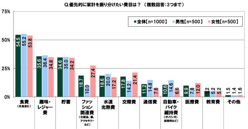 全回答者(1,000名)に、優先的に家計を振り分けたい費目を聞いたところ、「食費(外食含む)」(54.5%)が最も高くなり、「趣味・レジャー費」(35.6%)、「貯蓄」(34.6%)、「ファッション関連費(化粧品、服、アクセサリーなど)」(18.7%)、「水道光熱費」(18.6%)が続きました。