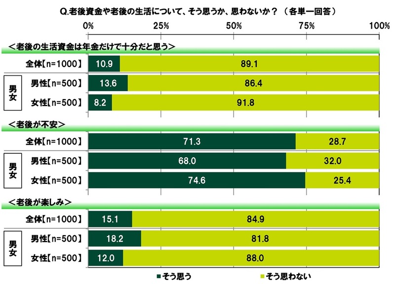 「老後が不安」男性では68.0%、女性では74.6%