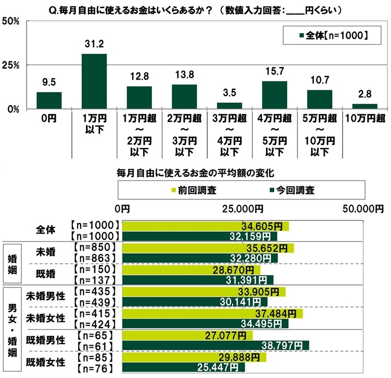 前回の調査結果(※1)と比較すると、毎月自由に使えるお金の平均は2,446円の減少(前回調査34,605円→今回調査32,159円)となりました。