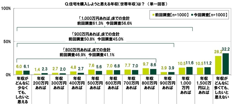 また、住宅を購入しようと思える世帯年収額を聞いたところ、20代の半数以上がイメージできるのは、前回調査では年収900万円(50.8%)、今回調査では年収1,000万円(56.6%)と、こちらもハードルが上昇しました。