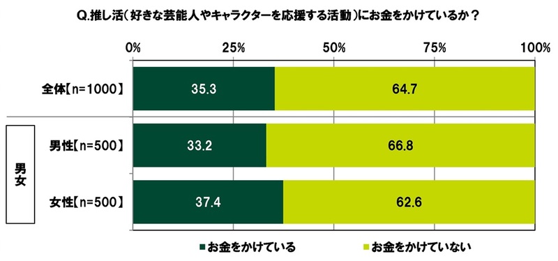 全回答者(1,000名)に、推し活(好きな芸能人やキャラクターを応援する活動)にお金をかけているか聞いたところ、お金をかけている人の割合は35.3%となりました。