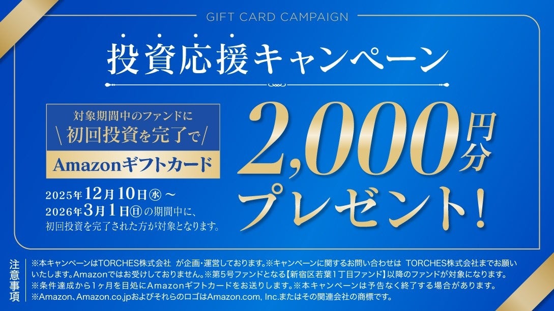 これまでの募集では想定を上回るお申込みを多数いただき、「募集が早期に埋まり投資機会を逃した」との声も頂戴しました。より多くの方にTORCHESでの投資機会をご検討いただけるよう、現在実施中のAmazonギフトカードキャンペーンの実施期間を延長いたします。詳細条件は各募集ページにてご案内します。