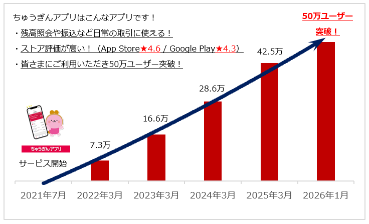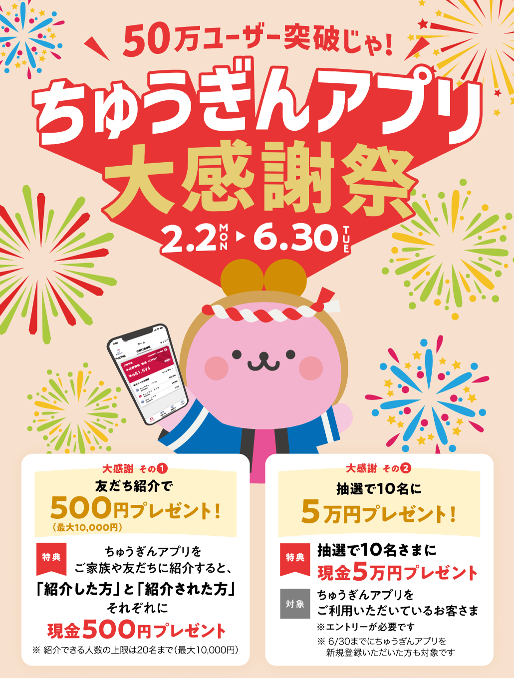 中国銀行(岡山市 頭取 加藤 貞則)は、「ちゅうぎんアプリ」のユーザー数が50万人を突破したことを記念し、2026年2月2日(月)~2026年6月30日(火)の期間限定で、「50万ユーザー突破じゃ!ちゅうぎんアプリ大感謝祭」を開催いたします。