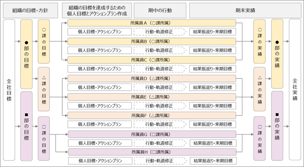 • そのためには、全社目標を部門・個人レベルに連鎖させ、部下の経験や志向を踏まえた目標を設定し、達成可能性と挑戦性のバランスを取ることが重要です