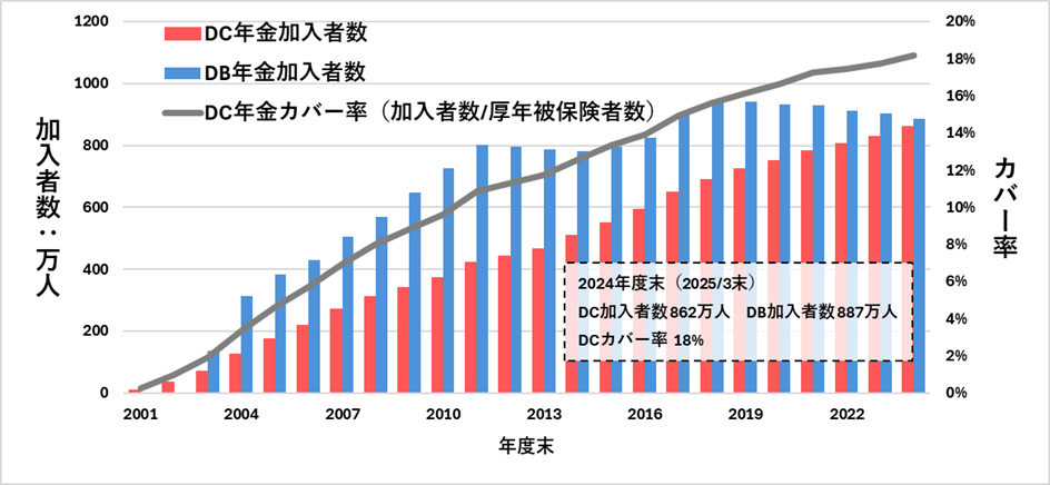 出所:DC:運営管理機関連絡協議会「確定拠出年金統計資料」、DB:信託協会「企業年金(確定給付型)の受託状況」、カバー率:厚生労働省資料データより筆者算出