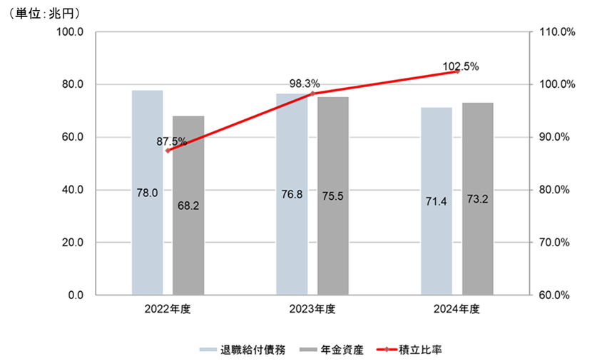 ・合計値における積立比率(年金資産/退職給付債務)は102.5%と、前年度(98.3%)に比べ4.2%ポイント上昇