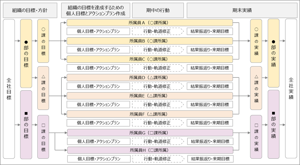• そのためには、全社目標を部門・個人レベルに連鎖させ、部下の経験や志向を踏まえた目標を設定し、達成可能性と挑戦性のバランスを取ることが重要です