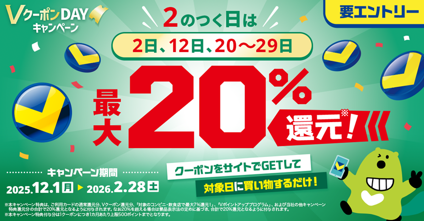 「2のつく日はVクーポンDAY!対象クーポンで最大20%還元!」のキャンペーン詳細やVクーポンのご利用方法は以下のページよりご確認ください。