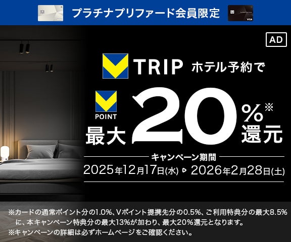 対象期間中に、Vトリップ内でVpass IDを設定したうえで、国内ホテル・海外ホテルを対象カードで予約・決済したお客さまを対象に、プラチナプリファード会員さまには最大20%、ゴールドカード会員さまにはもれなく9%のVポイントを還元いたします。