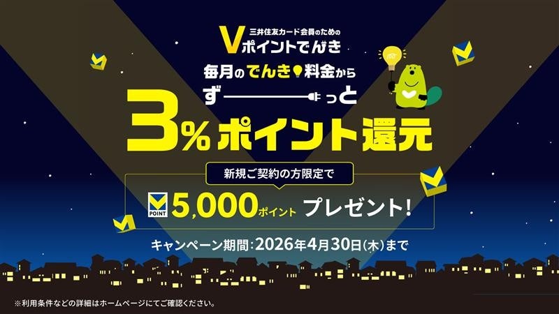 キャンペーン期間中に、Vポイントでんきへのお申込みを完了されたお客さまへ、5,000円相当のVポイントをプレゼントいたします。