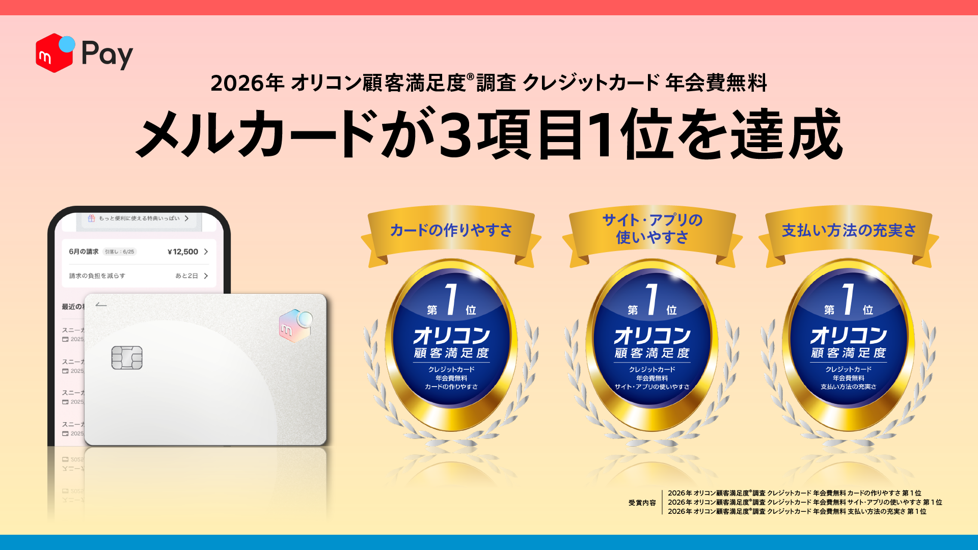 株式会社メルペイ(以下、メルペイ)が提供するクレジットカード「メルカード」は、「2026年 オリコン顧客満足度®調査 クレジットカード 年会費無料」のランキングにおいて、「カードの作りやすさ」「サイト・アプリの使いやすさ」「支払い方法の充実さ」の3つの評価項目で初の第1位を獲得したことをお知らせいたします。