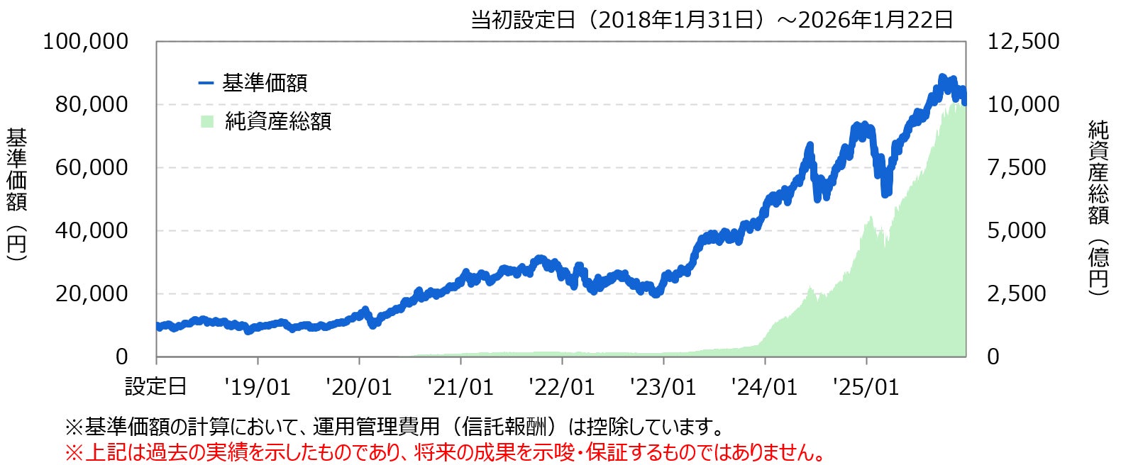 当ファンドは、多くの投資家の皆様からご支持を賜り、2025年12月に純資産総額1兆円を突破いたしました。FANG+指数は、米国の主要テクノロジー企業10銘柄で構成される集中投資型の株価指数であり、近年は力強い成長を背景に、高いリターンを実現してまいりました。当指数は値動きが大きく、短期的には大幅に下落することもありますが、中長期的な値上がりが期待される場合には、積立投資によるメリットをより大きく享受できる可能性もあります。