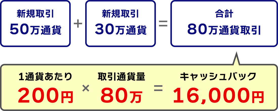 キャンペーン期間中に新規に稼働した対象通貨ペアの自動売買でのお取引で、1万通貨あたり200円、新規取引・決済取引で合計400円をキャッシュバックいたします。キャッシュバック金額の上限はありません。