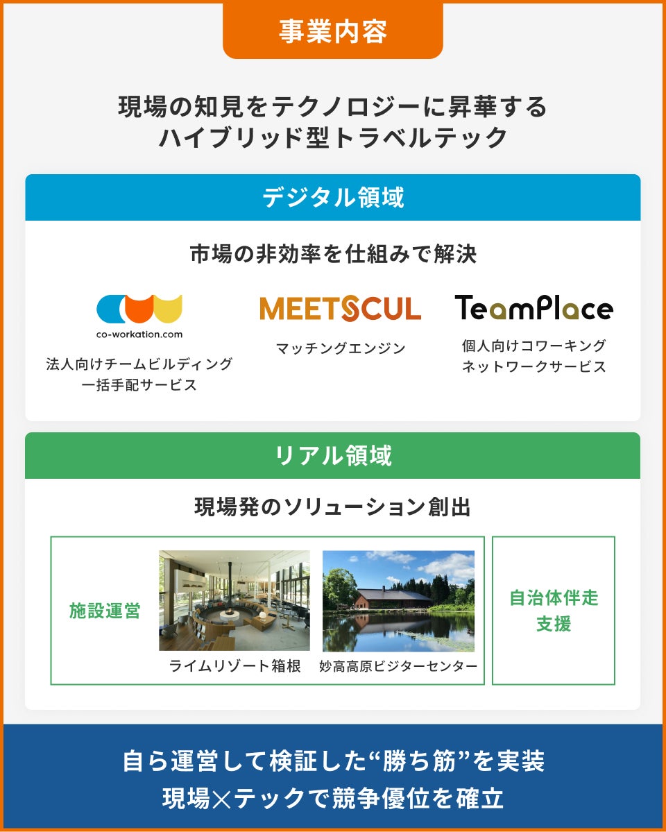 ・事業概要:法人合宿・グループ旅行に特化した一括手配プラットフォームの運営・開発