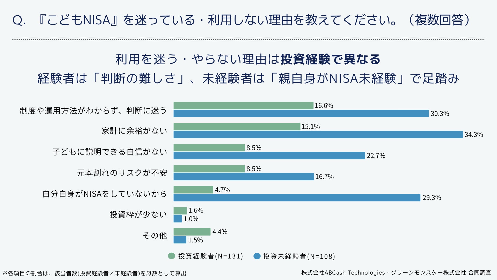 株式会社ABCash Technologies(本社:東京都渋谷区、代表取締役社長:辻 侑吾)は、グリーンモンスター株式会社(本社:東京都渋谷区、代表取締役:小川 亮)と合同で、18歳未満の子どもを持つ投資経験と投資未経験の保護者492名を対象に『こどもNISA』に関する調査を実施しました。