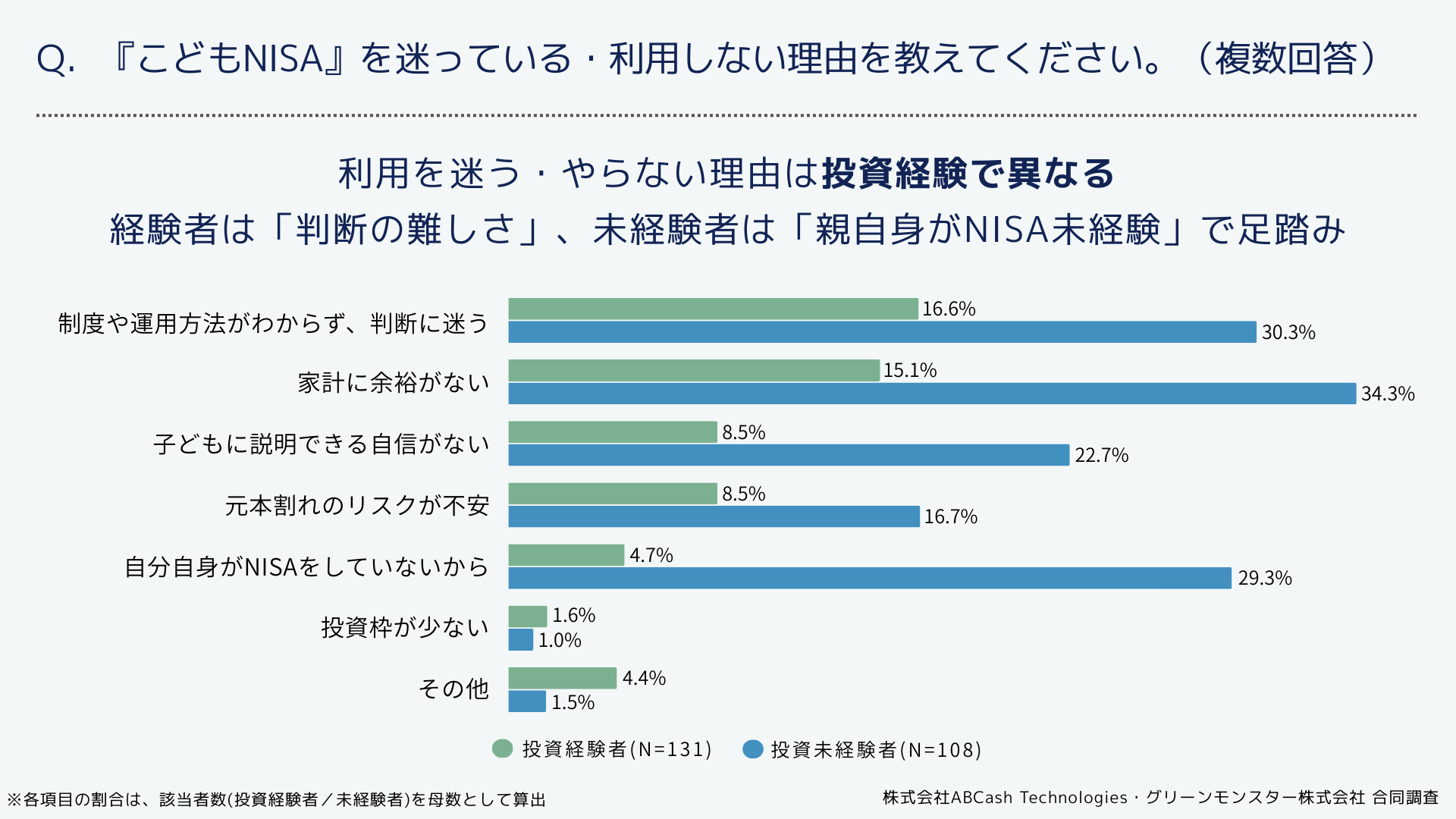 株式会社ABCash Technologies(本社:東京都渋谷区、代表取締役社長:辻 侑吾)は、グリーンモンスター株式会社(本社:東京都渋谷区、代表取締役:小川 亮)と合同で、18歳未満の子どもを持つ投資経験と投資未経験の保護者492名を対象に『こどもNISA』に関する調査を実施しました。