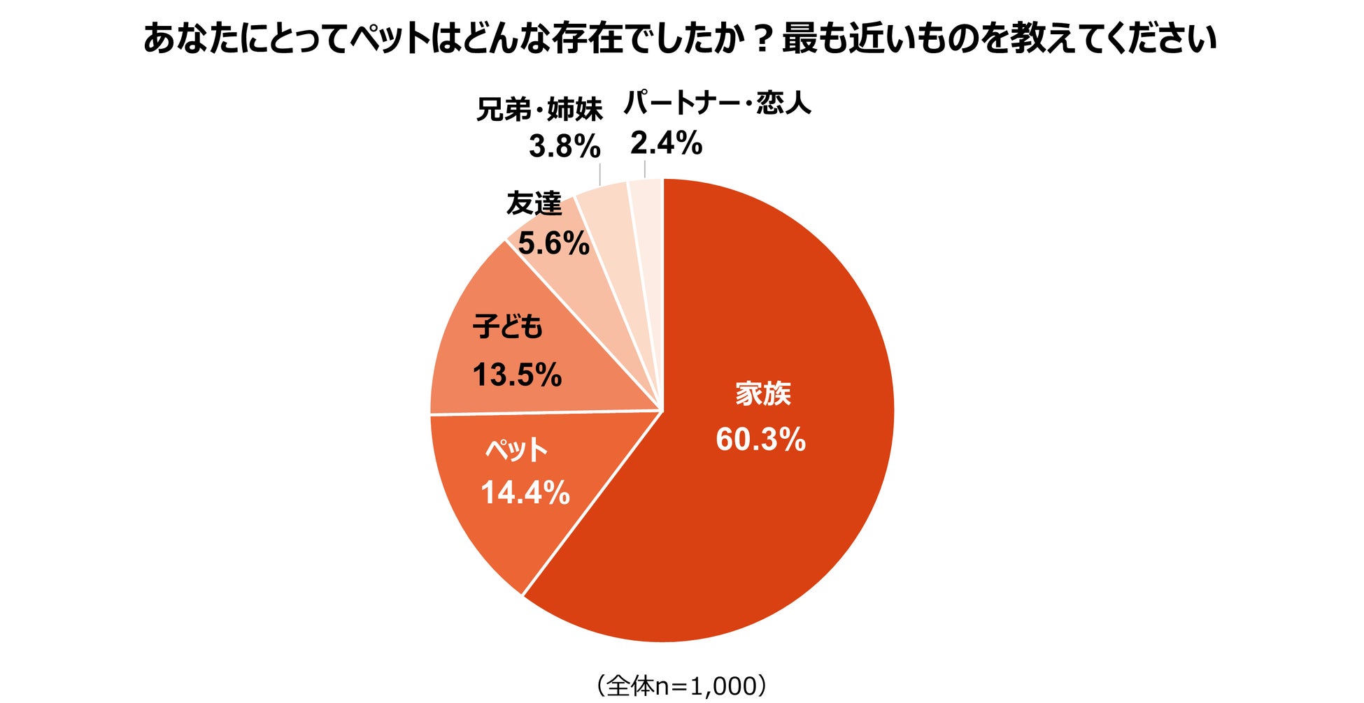あなたにとってペットはどんな存在でしたかという問いに対しては、「家族」と回答した飼育者が60.3%で最多となりました。次いで「ペット」が14.4%、「子ども」が13.5%と続きました。「家族」(60.3%)「子ども」(13.5%)「兄弟・姉妹」(3.8%)など、ペットを人間と同等の家族として捉えている回答を合わせると約8割にのぼる結果となりました。