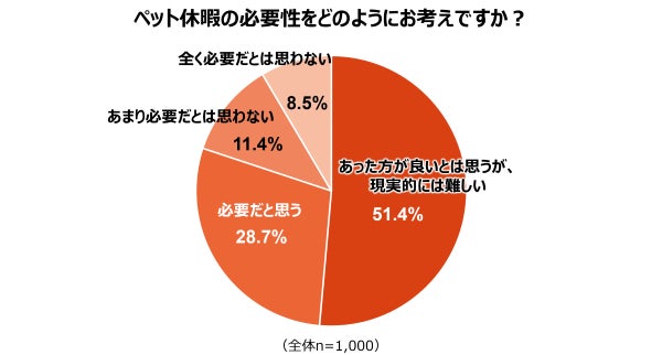 ペット休暇の必要性については、「あった方が良いとは思うが、現実的には難しい」が51.4%で過半数を占めました。これに「必要だと思う」(28.7%)を合わせると、約8割がペット休暇の必要性を感じています。しかし、現実的な運用には難しさを感じている飼育者が多いことが分かりました。