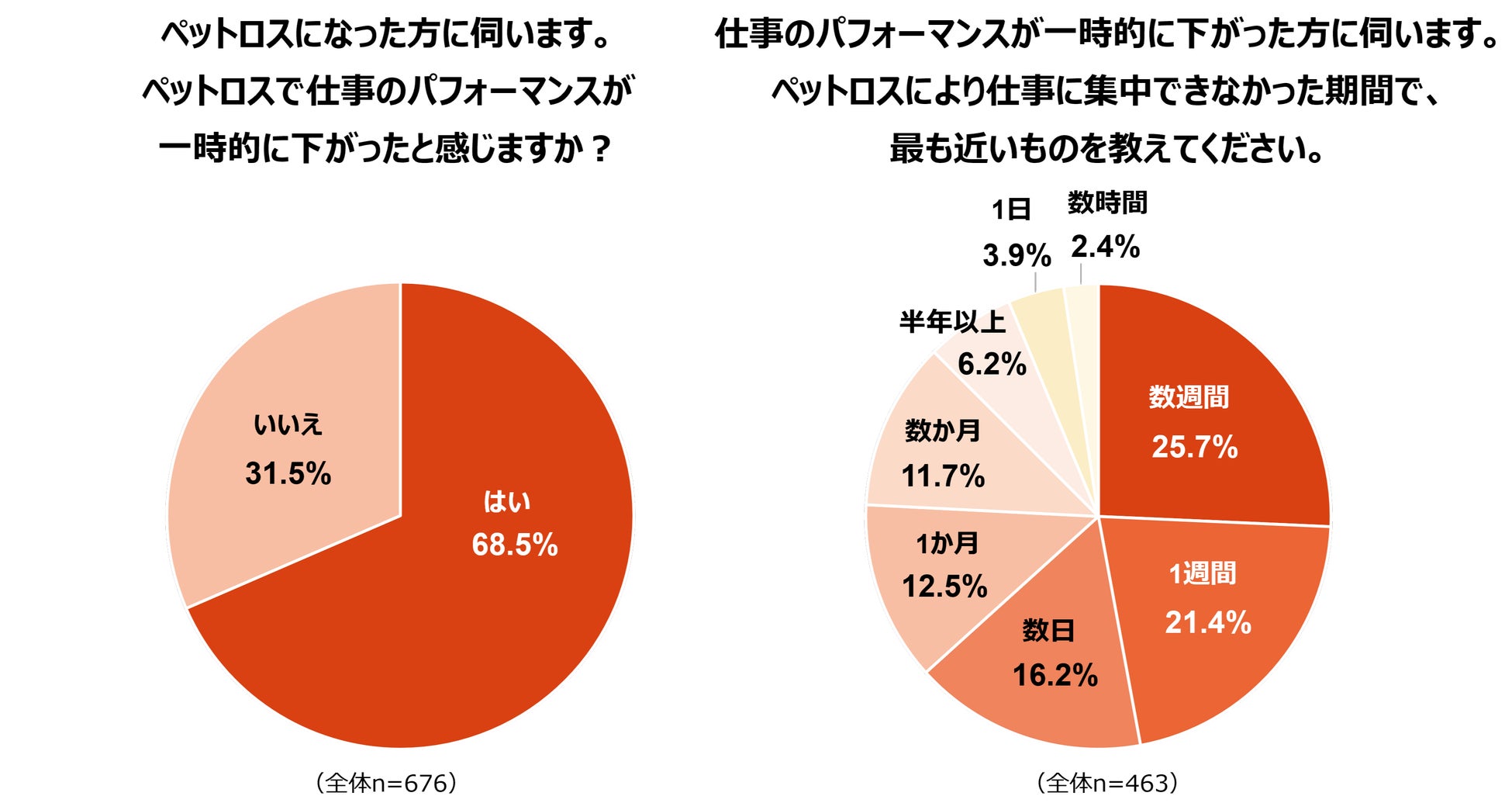 ◆ペットロスで仕事のパフォーマンスが下がった飼育者は約7割で、数週間仕事に集中できない人も