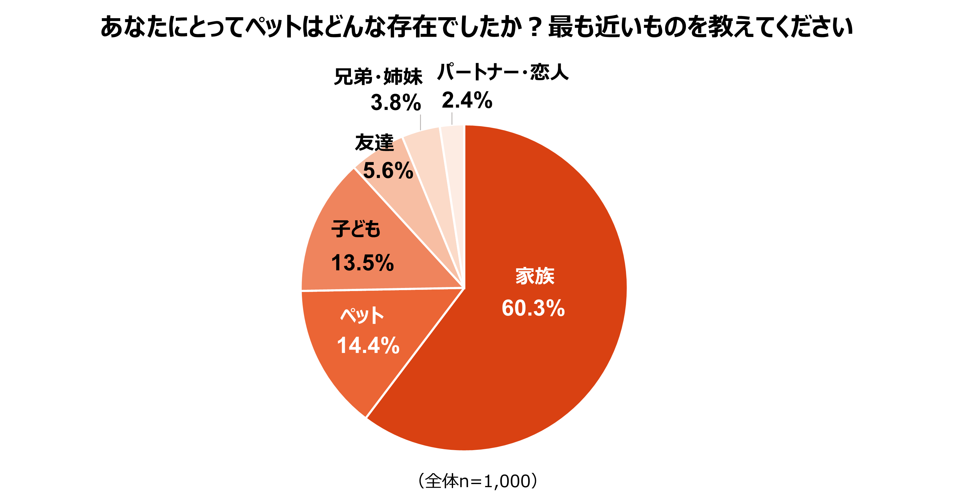 あなたにとってペットはどんな存在でしたかという問いに対しては、「家族」と回答した飼育者が60.3%で最多となりました。次いで「ペット」が14.4%、「子ども」が13.5%と続きました。「家族」(60.3%)「子ども」(13.5%)「兄弟・姉妹」(3.8%)など、ペットを人間と同等の家族として捉えている回答を合わせると約8割にのぼる結果となりました。