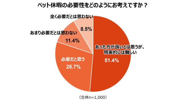 ペット休暇の必要性については、「あった方が良いとは思うが、現実的には難しい」が51.4%で過半数を占めました。これに「必要だと思う」(28.7%)を合わせると、約8割がペット休暇の必要性を感じています。しかし、現実的な運用には難しさを感じている飼育者が多いことが分かりました。