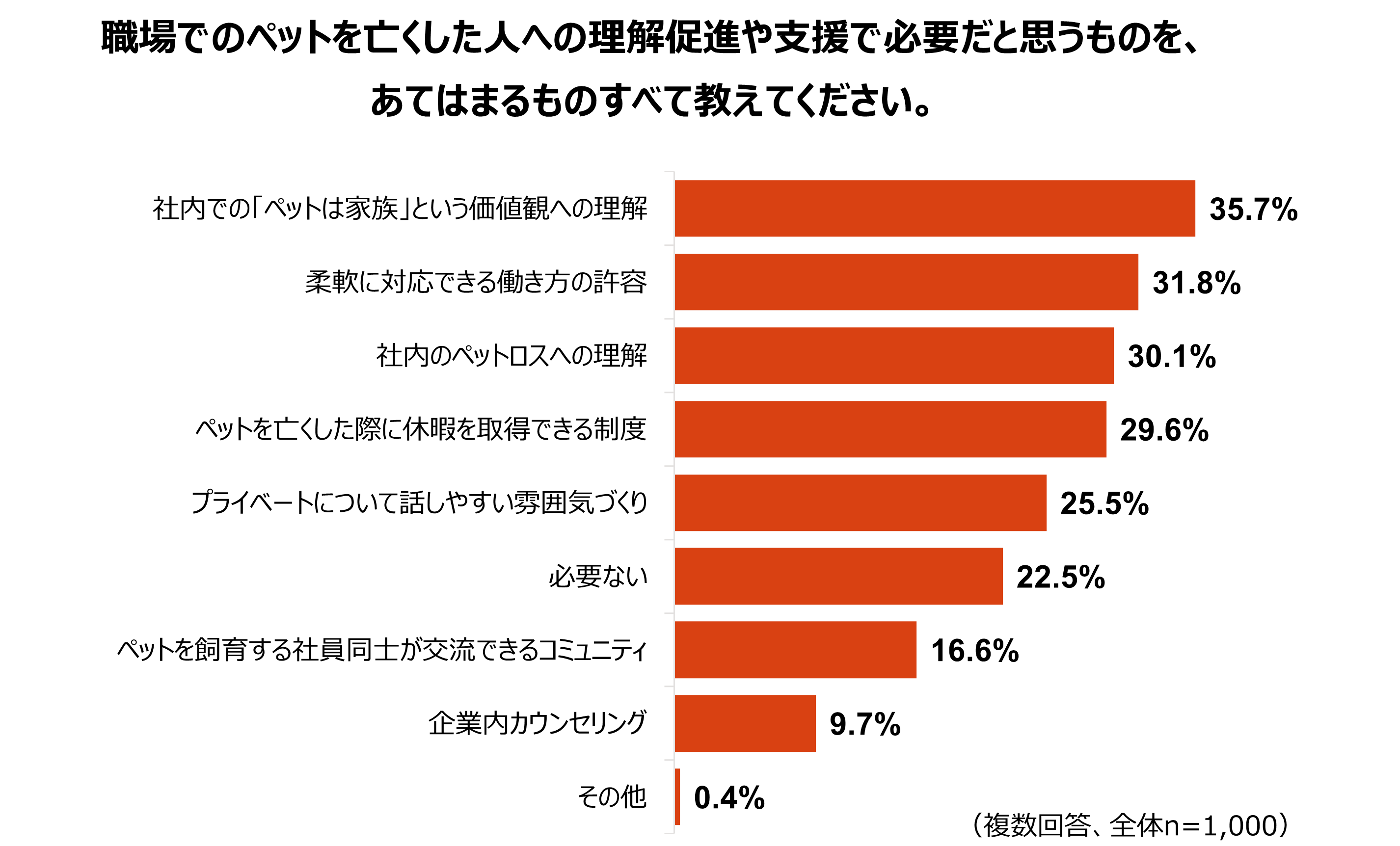 職場でペットを亡くした人への理解促進や支援で必要だと思うものについては、「社内での『ペットは家族』という価値観への理解」が35.7%で最多でした。次いで「柔軟に対応できる働き方の許容」(31.8%)、「社内のペットロスへの理解」(30.1%)、「ペットを亡くした際に休暇を取得できる制度」(29.6%)が続き、制度の導入だけでなく、職場全体の意識や風土に関する項目が上位に挙がりました。