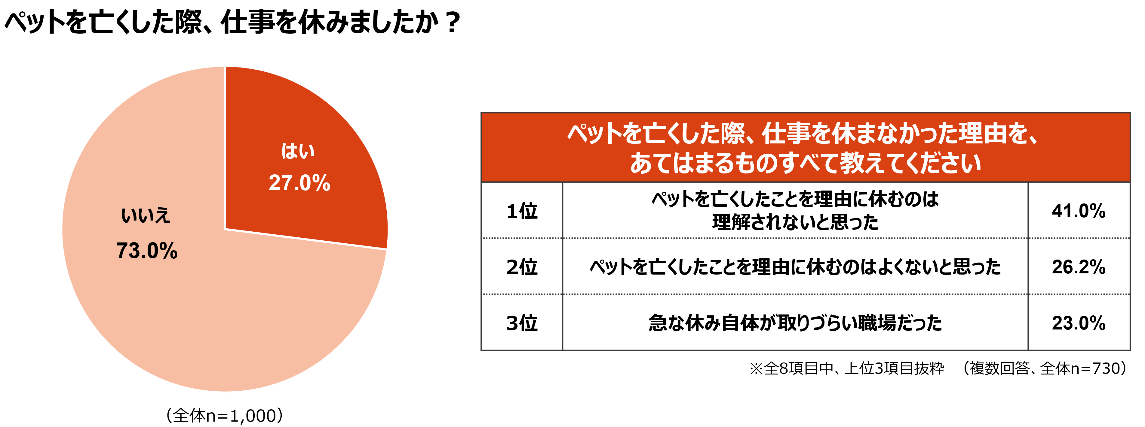 ペットを亡くした際、仕事を休んだかという問いには、73.0%が「いいえ」と回答しました。仕事を休まなかった理由として最も多かったのは「ペットを亡くしたことを理由に休むのは理解されないと思った」が41.0%でした。次いで「ペットを亡くしたことを理由に休むのはよくないと思った」が26.2%で、ペットを亡くしたことを理由に休むのは理解されない、またはよくないと考える飼育者が一定数いることが分かりました。