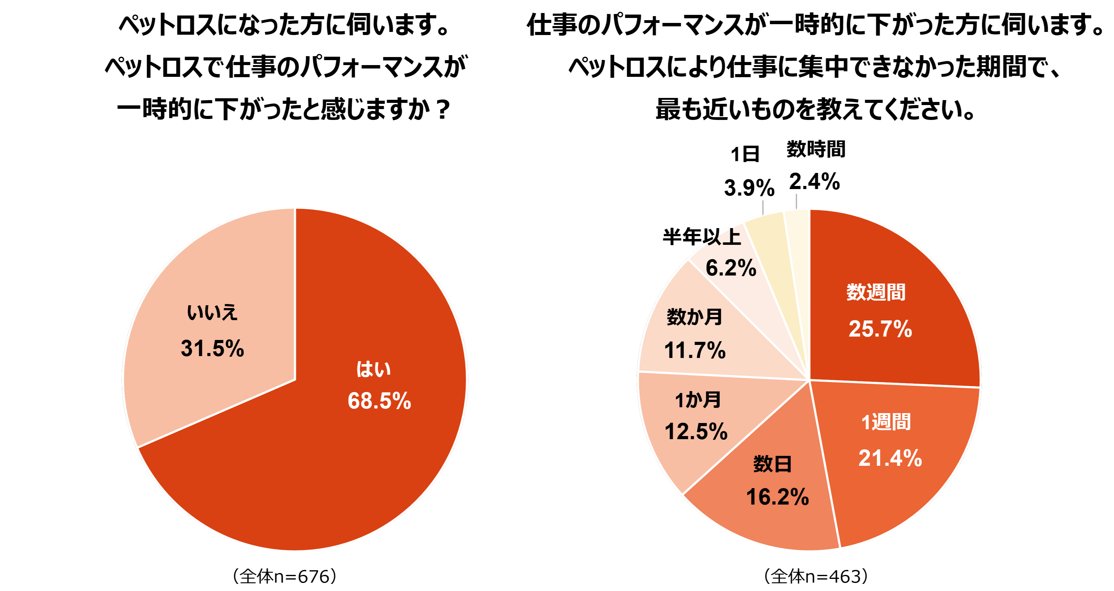 ◆ペットロスで仕事のパフォーマンスが下がった飼育者は約7割で、数週間仕事に集中できない人も