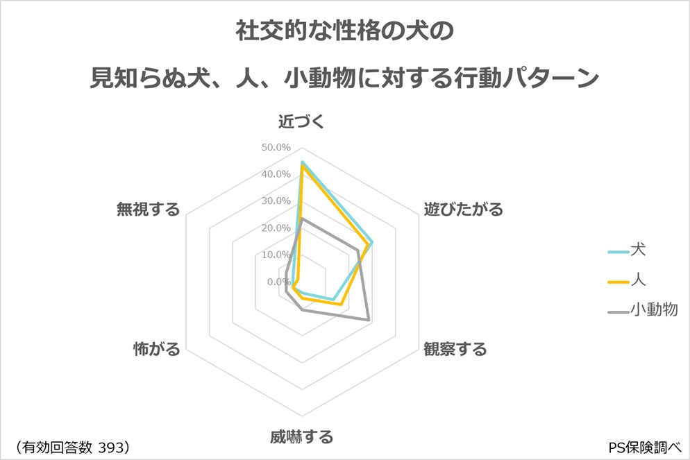見知らぬ犬や人、小動物のいずれに対しても、「遊びたがる」(犬35.4%、人31.6%、小動物29.6%)が最多で、初対面でも遊び相手として認識する様子がうかがえます。