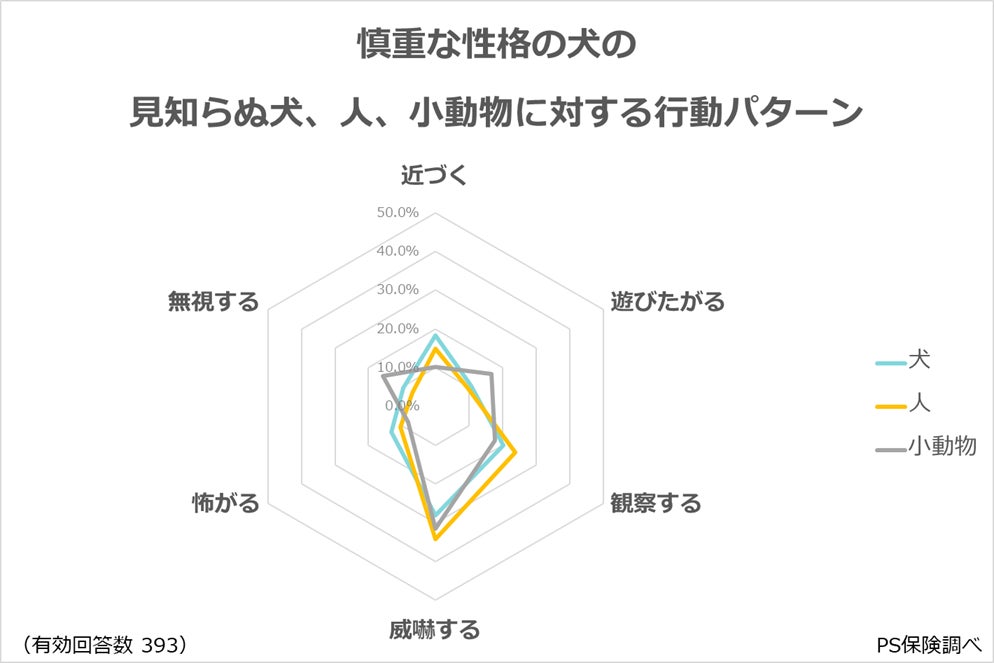 これらの性格別に、見知らぬ犬、人、(猫や鳥のような)小動物に対する反応として最も当てはまるものの回答を集計しています。