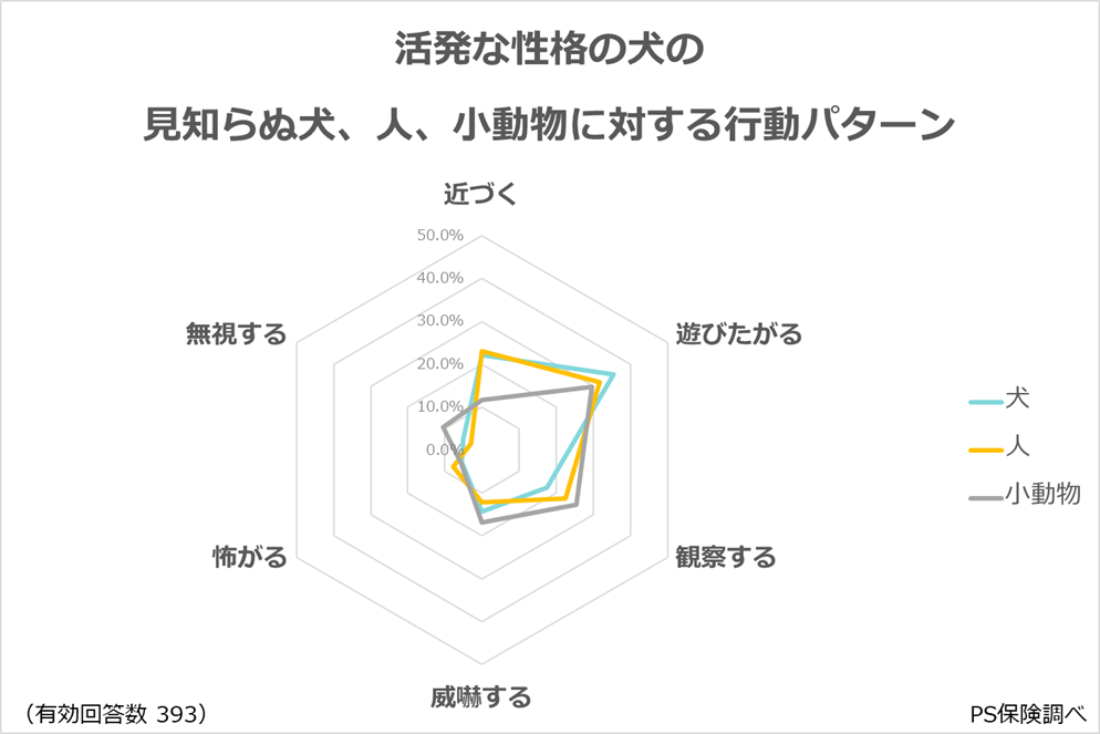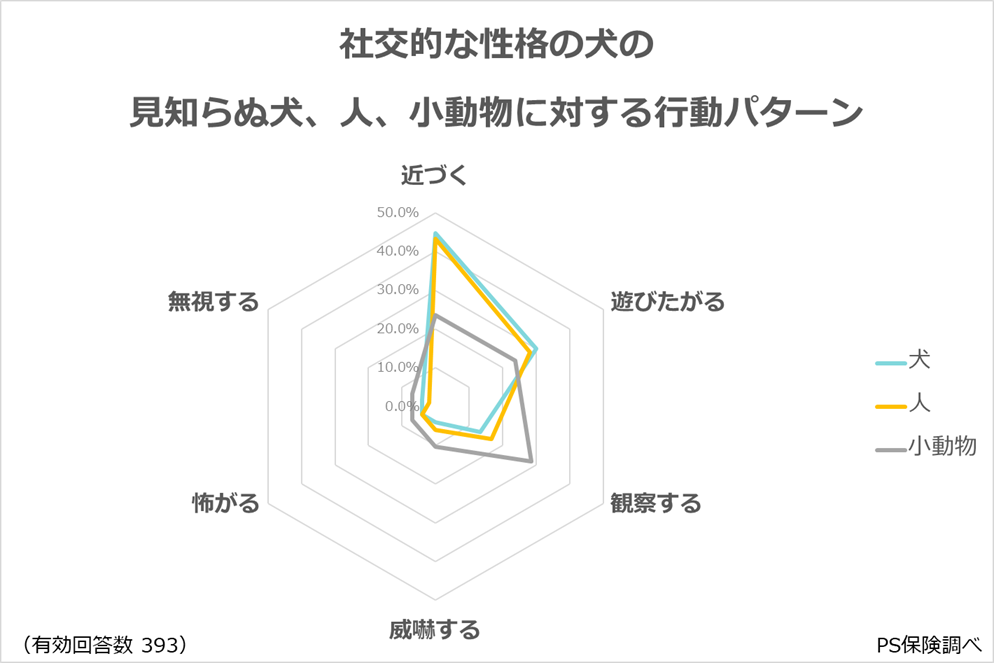 見知らぬ犬や人、小動物のいずれに対しても、「遊びたがる」(犬35.4%、人31.6%、小動物29.6%)が最多で、初対面でも遊び相手として認識する様子がうかがえます。