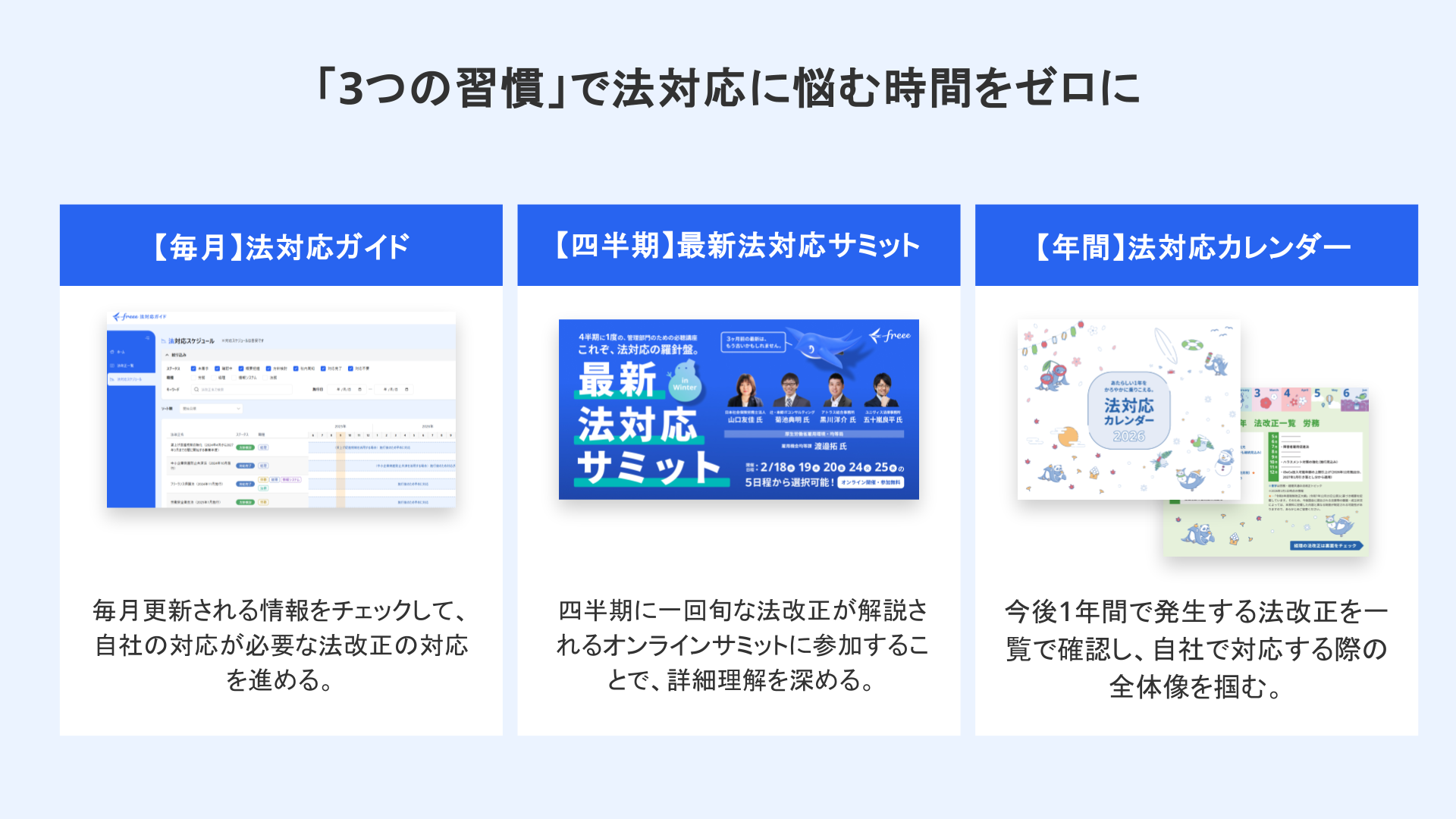 法改正を「負担の大きい特殊業務」から「日常のポジティブな業務」へと変えるため、freeeが「毎月・四半期・年間」のサイクルで提供する以下3つのコンテンツについて、当行お取引き先企業への情報提供をおこないます。