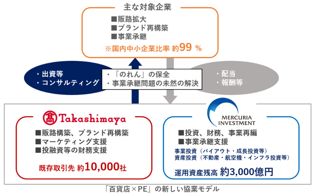 株式会社髙島屋(代表取締役社長:村田 善郎、以下「髙島屋」)と株式会社マーキュリアホールディングスの子会社である株式会社マーキュリアインベストメント(代表取締役:豊島 俊弘)及び株式会社マーキュリアアドバイザリー(代表取締役:深井 聡明、2社総称して以下「マーキュリア」)は、両社協業のもと、国内中小企業が有する伝統・技術を守り、文化・歴史を未来につなぐ「百年のれんプロジェクト」を発足いたしましたので、下記のとおりお知らせいたします。