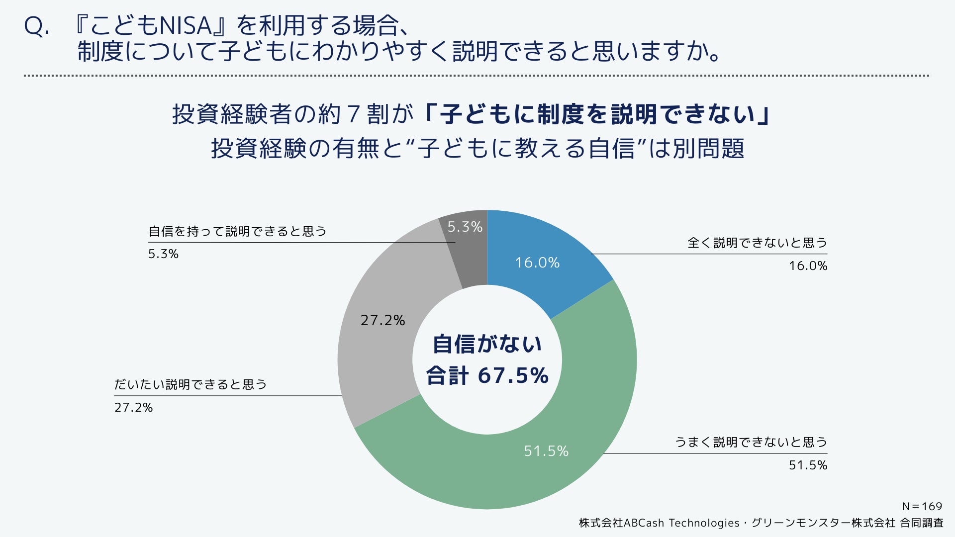 グリーンモンスター株式会社は、株式会社ABCash Technologies(本社:東京都渋谷区、代表取締役社長:辻 侑吾)と合同で、18歳未満の子どもを持つ投資経験者169名を対象に『こどもNISA』に関する意識調査を実施いたしました。