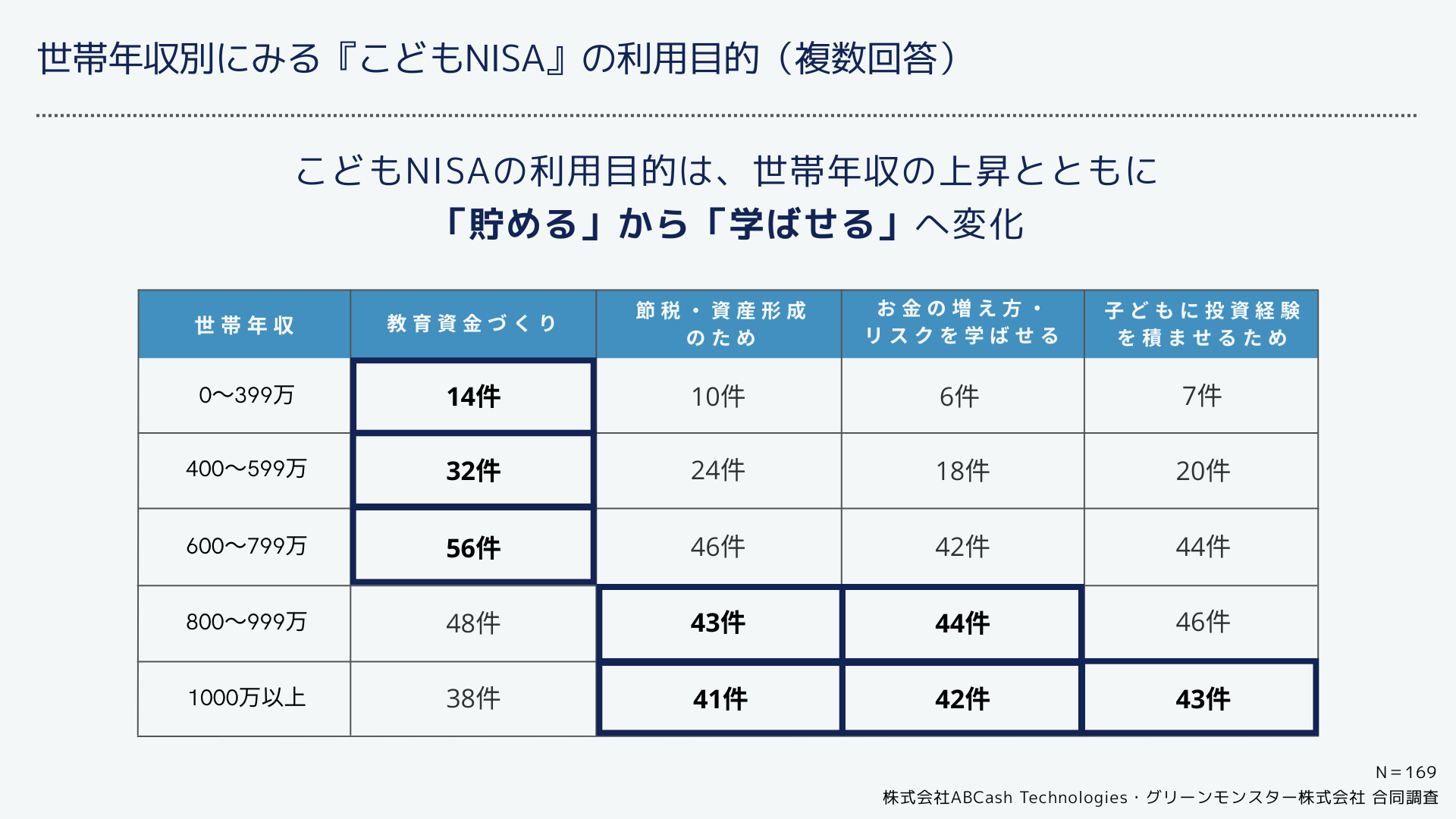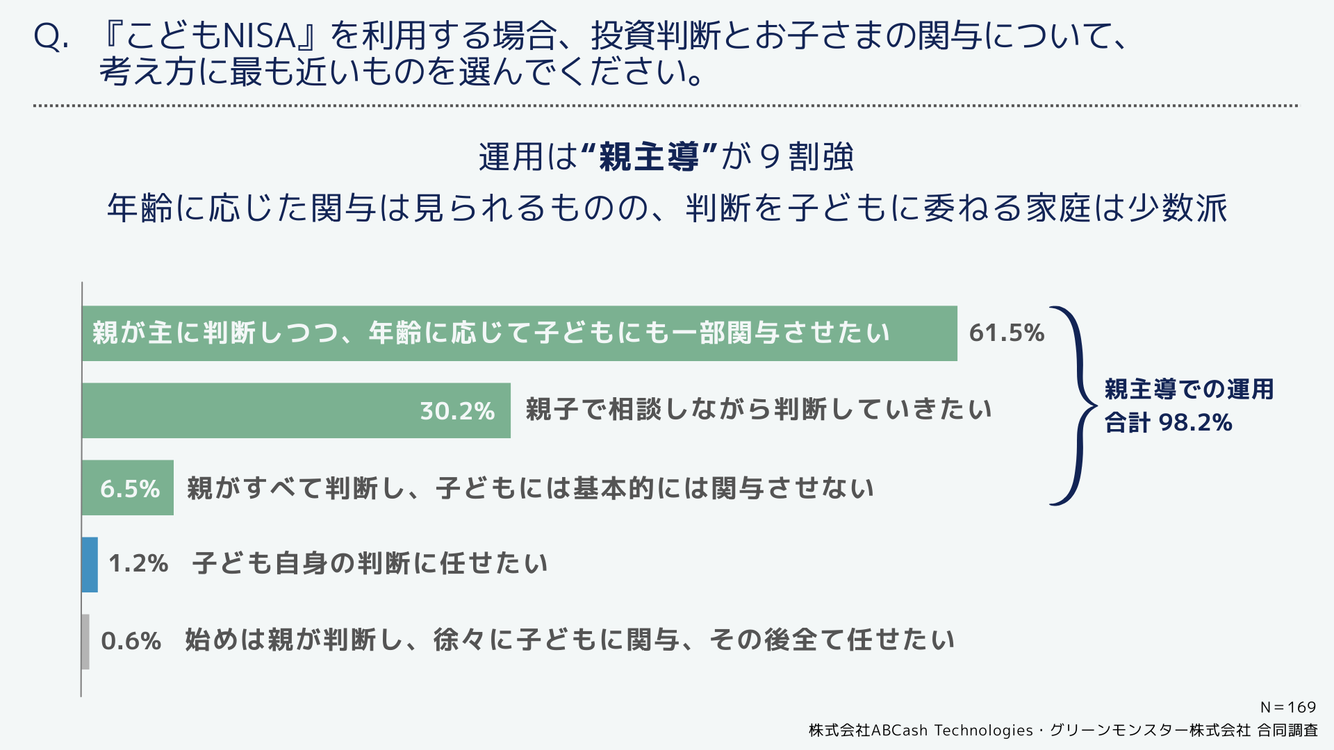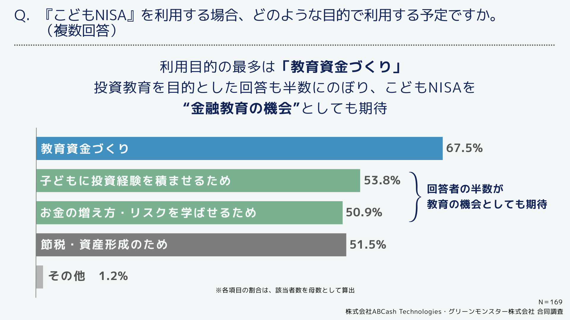 グリーンモンスター株式会社は、株式会社ABCash Technologies(本社:東京都渋谷区、代表取締役社長:辻 侑吾)と合同で、18歳未満の子どもを持つ投資経験者169名を対象に『こどもNISA』に関する意識調査を実施いたしました。