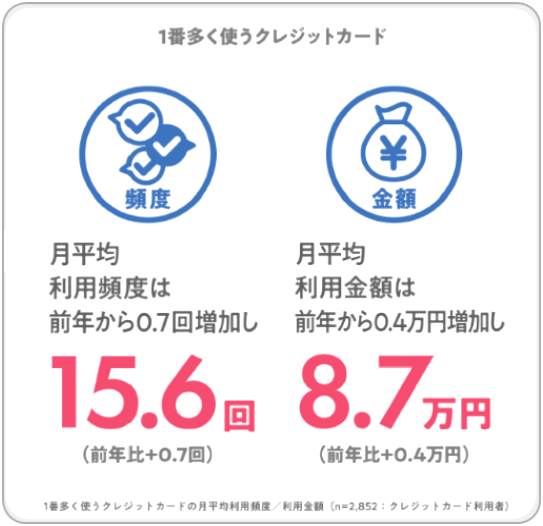 1番多く使うクレジットカードの月平均利用頻度は15.6回、月平均利用金額は8.7万円。