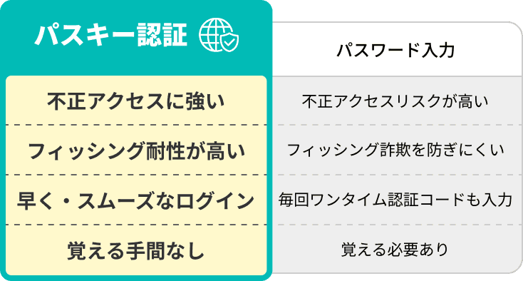 パスキーを登録いただくことで高い安全性と利便性を両立することができ、以下のようなメリットがあります。