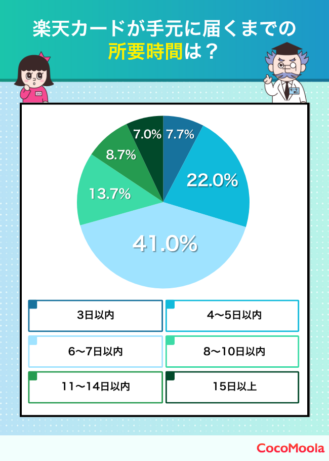 • 楽天カードの発行スピードは、41%が「6~7日以内」と回答。