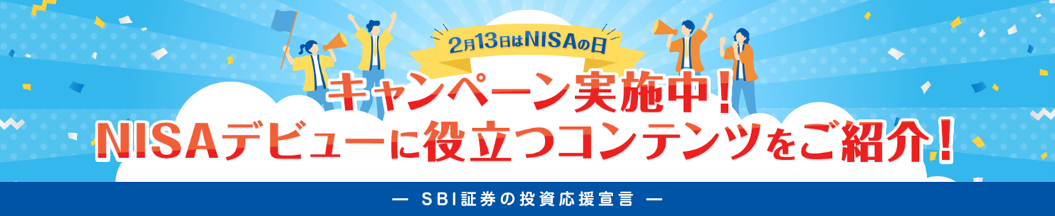 株式会社SBI証券(本社:東京都港区、代表取締役社長:髙村正人、以下「当社」)は、2026年2月13日(金)の「NISAの日」に合わせて、当社のXアカウントの投稿をリポストすると1万円分のデジタルギフト券が当たるキャンペーンを実施します。そのほか、「投資情報メディア」で発信しているNISA関連のレポート・コラムなど、NISAデビューに役立つコンテンツを当社WEBサイトにて紹介します。