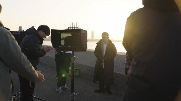 冷たい空気が漂う早朝、朝日に照らされる湾岸の防波堤で撮影がスタート。卒業証書を手にした男子高校生と海を眺めながら、「この通帳がな、大人の入り口のチケットみたいなもんや」という名セリフが飛び出すシーンは、まるで青春映画のワンシーンのよう。しかし、手数料の話題を振られた途端、言葉に詰まる津田さん。そのまま全力で走り去る少年の背中を、呆然と見送ることしかできません。防波堤に一人取り残された津田さんの、なんとも言えない物悲しい表情に、現場からは思わず笑いがこぼれていました。