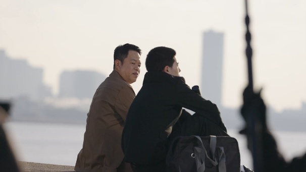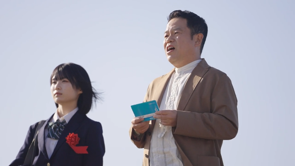 冷たい空気が漂う早朝、朝日に照らされる湾岸の防波堤で撮影がスタート。卒業証書を手にした男子高校生と海を眺めながら、「この通帳がな、大人の入り口のチケットみたいなもんや」という名セリフが飛び出すシーンは、まるで青春映画のワンシーンのよう。しかし、手数料の話題を振られた途端、言葉に詰まる津田さん。そのまま全力で走り去る少年の背中を、呆然と見送ることしかできません。防波堤に一人取り残された津田さんの、なんとも言えない物悲しい表情に、現場からは思わず笑いがこぼれていました。