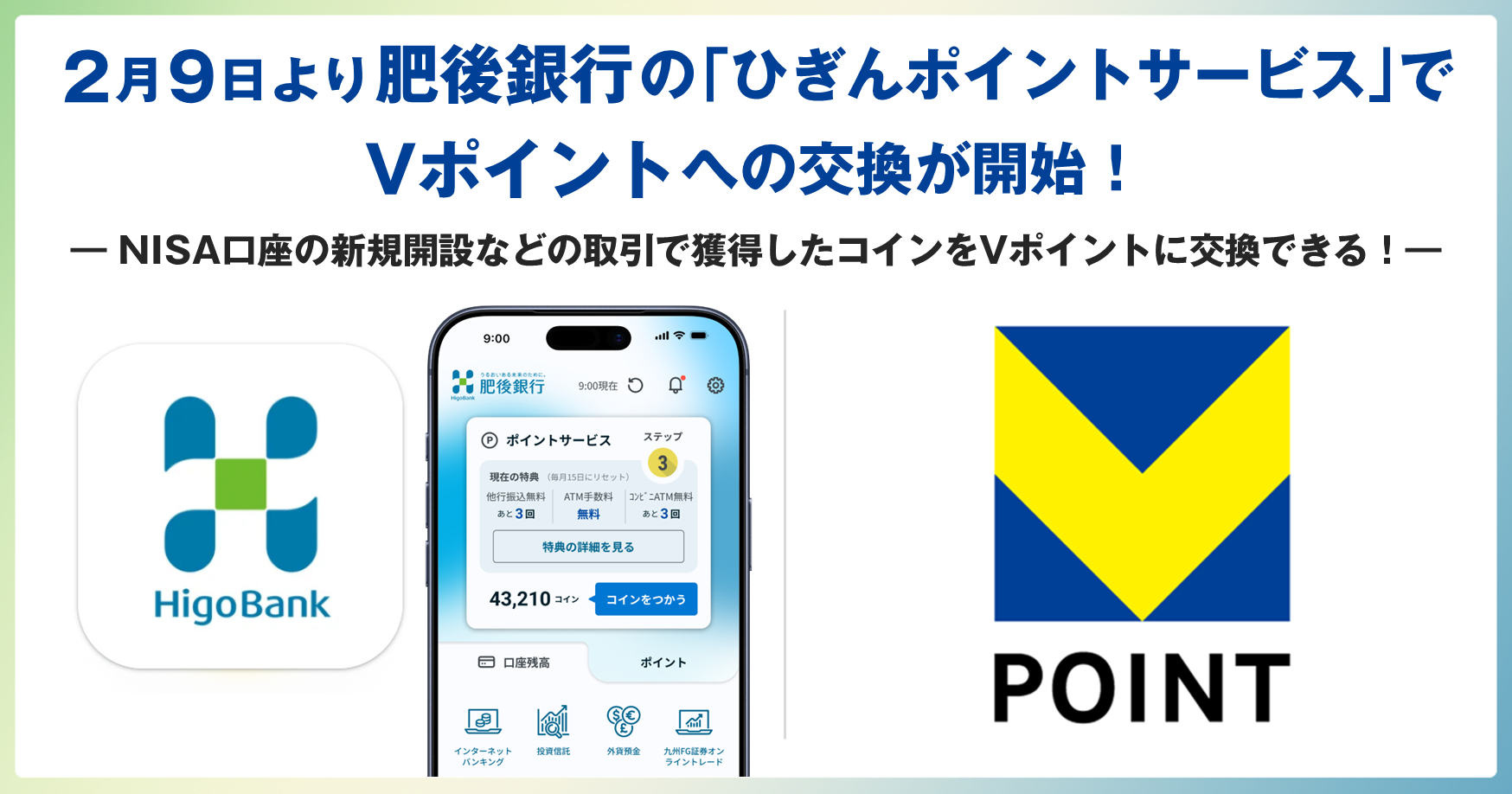 CCCMKホールディングス株式会社(本社:神奈川県横浜市、代表取締役社長兼CEO:髙橋 誉則、以下:「CCCMKHD」)と三井住友カード株式会社(本社:東京都江東区、代表取締役 社長執行役員 CEO:大西 幸彦、以下:「三井住友カード」)は、2026年2月9日(月)より株式会社肥後銀行(本社:熊本県熊本市、代表取締役頭取:笠原 慶久、以下:「肥後銀行」)が提供する「ひぎんポイントサービス」において、肥後銀行との取引などに応じて貯まるコイン(以下「ひぎんコイン」)をVポイントに交換できるサービスを開始いたします。