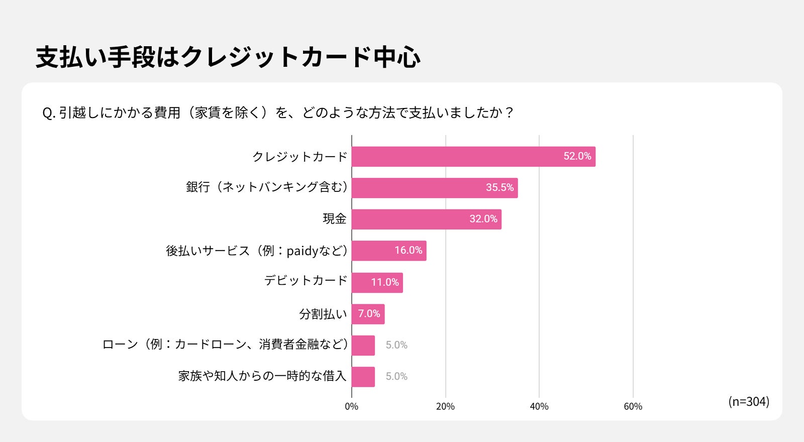 実際に引越し費用をどのように支払ったかを聞いたところ、複数回答で「クレジットカード(52.0%)」が最も多く、次いで「銀行振込(35.5%)」、「現金(32.0%)」と、従来型の支払い手段が中心となりました。一方、「後払いサービス(16.0%)」や「分割払い(7.0%)」など、支払いを分散・後ろ倒しできる方法を利用した人はいずれも2割未満にとどまりました。この結果から、こうした支払い方法はまだ一般的な選択肢として定着していないことがうかがえます。背景には、サービスの提供機会や認知の少なさ、利用条件への不安など、複数の要因が考えられます。