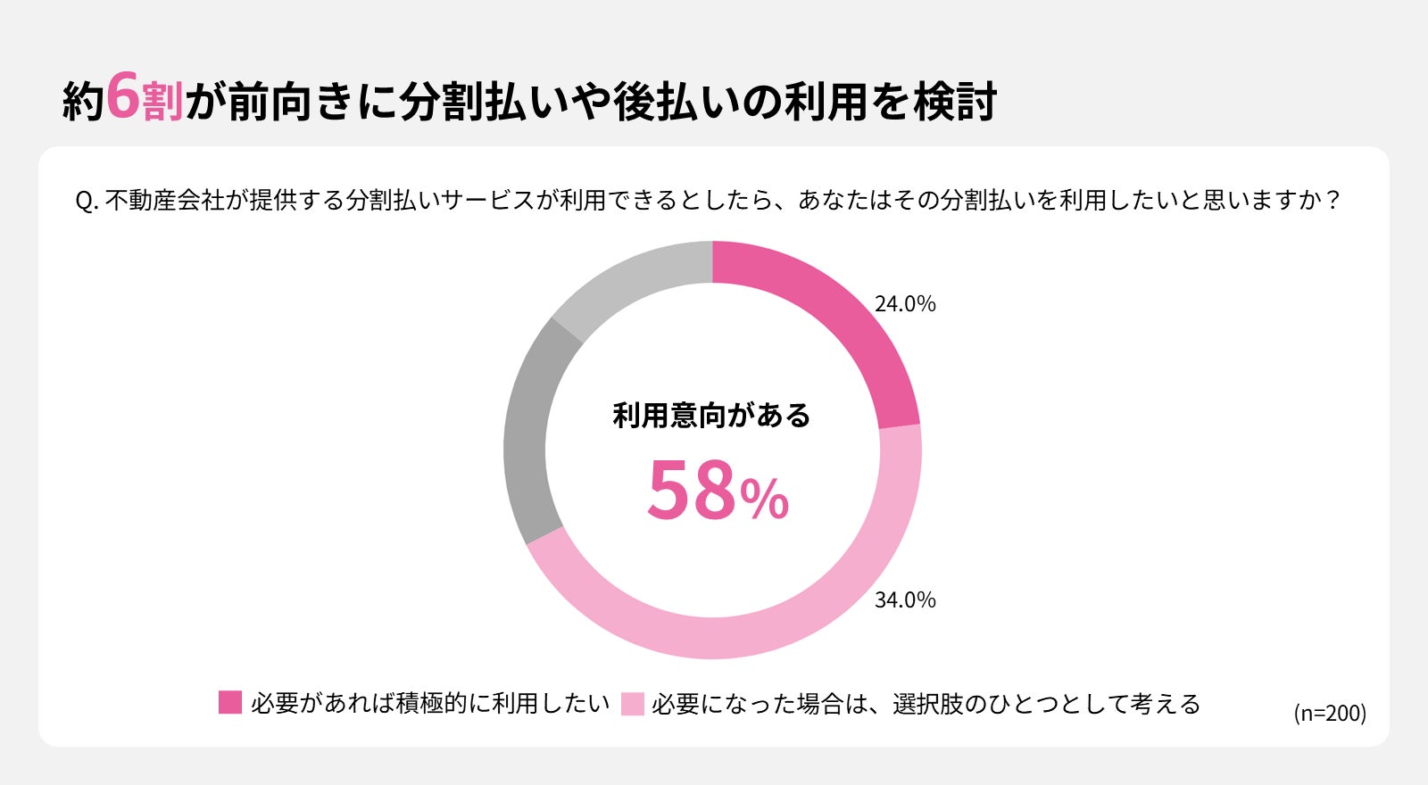 また、不動産会社が分割払いサービスを提供していた場合、24%の人が「必要があれば積極的に利用したい」、34%の人が「選択肢のひとつとして考える」と回答し、全体の約6割が“前向きに検討したい”意向を示しました。