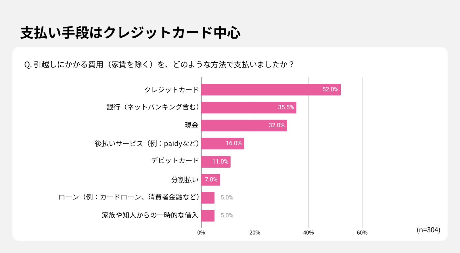 実際に引越し費用をどのように支払ったかを聞いたところ、複数回答で「クレジットカード(52.0%)」が最も多く、次いで「銀行振込(35.5%)」、「現金(32.0%)」と、従来型の支払い手段が中心となりました。一方、「後払いサービス(16.0%)」や「分割払い(7.0%)」など、支払いを分散・後ろ倒しできる方法を利用した人はいずれも2割未満にとどまりました。この結果から、こうした支払い方法はまだ一般的な選択肢として定着していないことがうかがえます。背景には、サービスの提供機会や認知の少なさ、利用条件への不安など、複数の要因が考えられます。