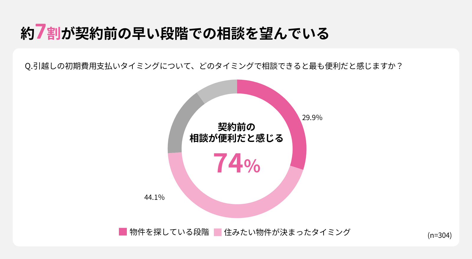 引越しに伴う初期費用の支払いタイミングについて、どの時点で相談できると最も便利だと感じるかを聞いたところ「住みたい物件が決まったタイミング」が44.1%で最多となりました。「物件を探している段階(29.9%)」も含めると、約7割が契約前の早い段階での相談を望んでいることが分かります。