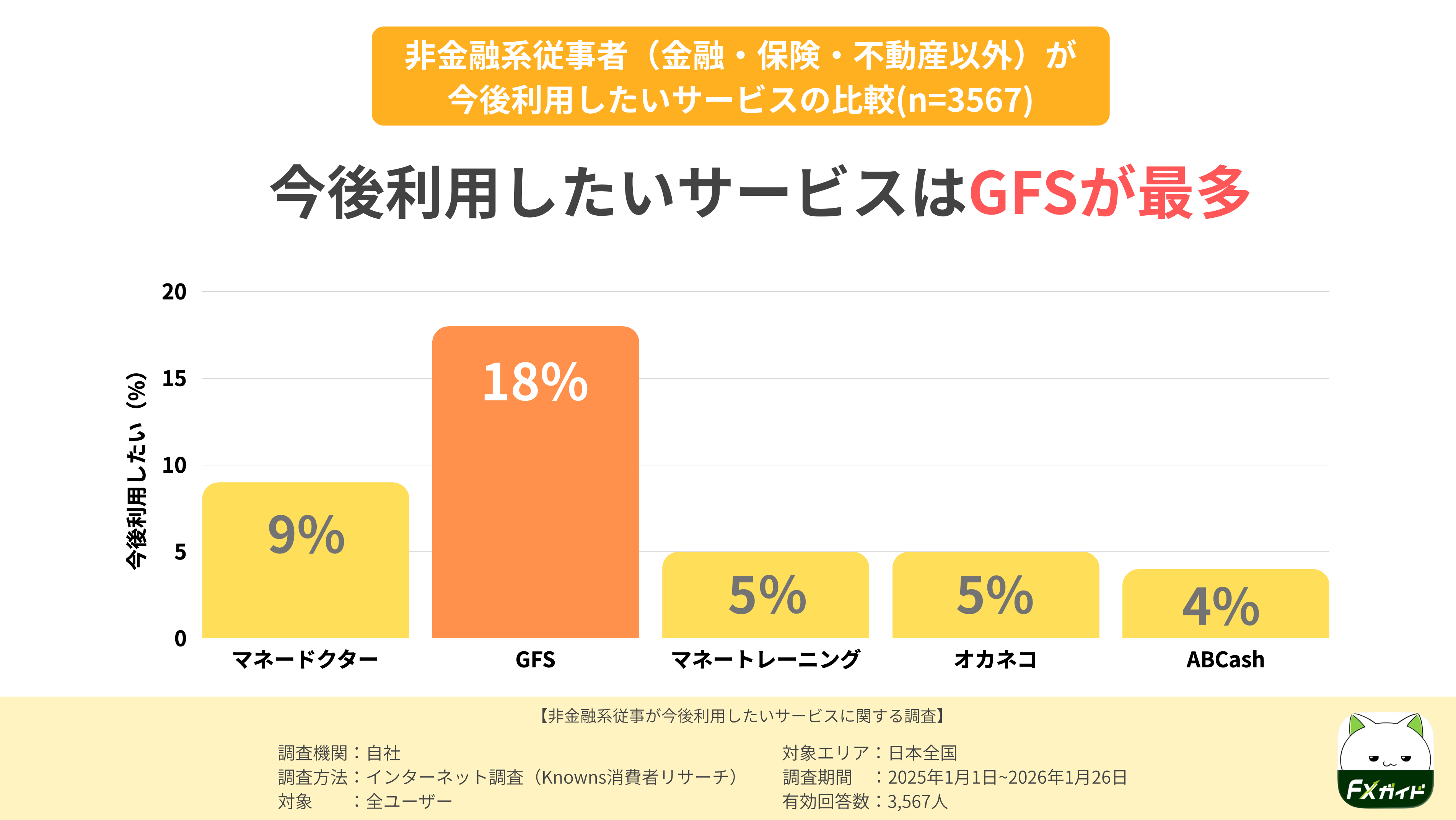・非金融系従事者を対象とした次回利用意向調査では、『GFS』が18%で最多となりました。