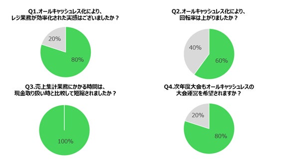 現金を取り扱っていた前年大会と比較し、全ての運営スタッフの方が「売上集計業務にかかる時間が短縮された」と回答しました。さらに、レジ業務の負担軽減や回転率に関しても、オールキャッシュレス化によるメリットを半数以上の方が感じられる結果となりました。