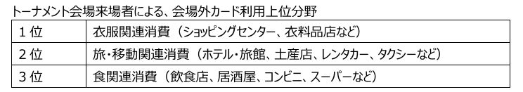 金額ベースで、最も利用が多かったのは衣服関連消費でした。これは大会観戦後に、会場近隣の大型ショッピングモールでショッピングを楽しまれた方が多数いらっしゃった結果と考えられます。