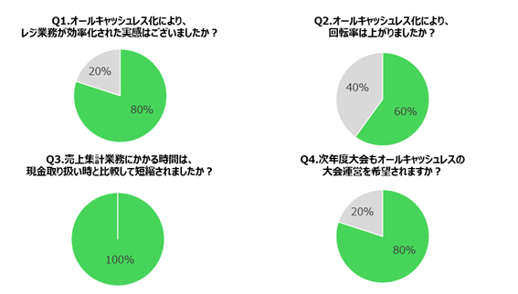 現金を取り扱っていた前年大会と比較し、全ての運営スタッフの方が「売上集計業務にかかる時間が短縮された」と回答しました。さらに、レジ業務の負担軽減や回転率に関しても、オールキャッシュレス化によるメリットを半数以上の方が感じられる結果となりました。